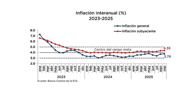 En lo que respecta a la inflación subyacente interanual, la misma se ubicó en 4.35 % en septiembre, permaneciendo dentro del objetivo establecido por el Banco Central. Este indicador permite extraer señales más claras para la conducción de la política monetaria, debido a que excluye algunos artículos que normalmente no responden a las condiciones de liquidez en la economía, como son los alimentos con gran variabilidad en sus precios, los combustibles y servicios con precios regulados como la tarifa eléctrica, el transporte, además de las bebidas alcohólicas y el tabaco.