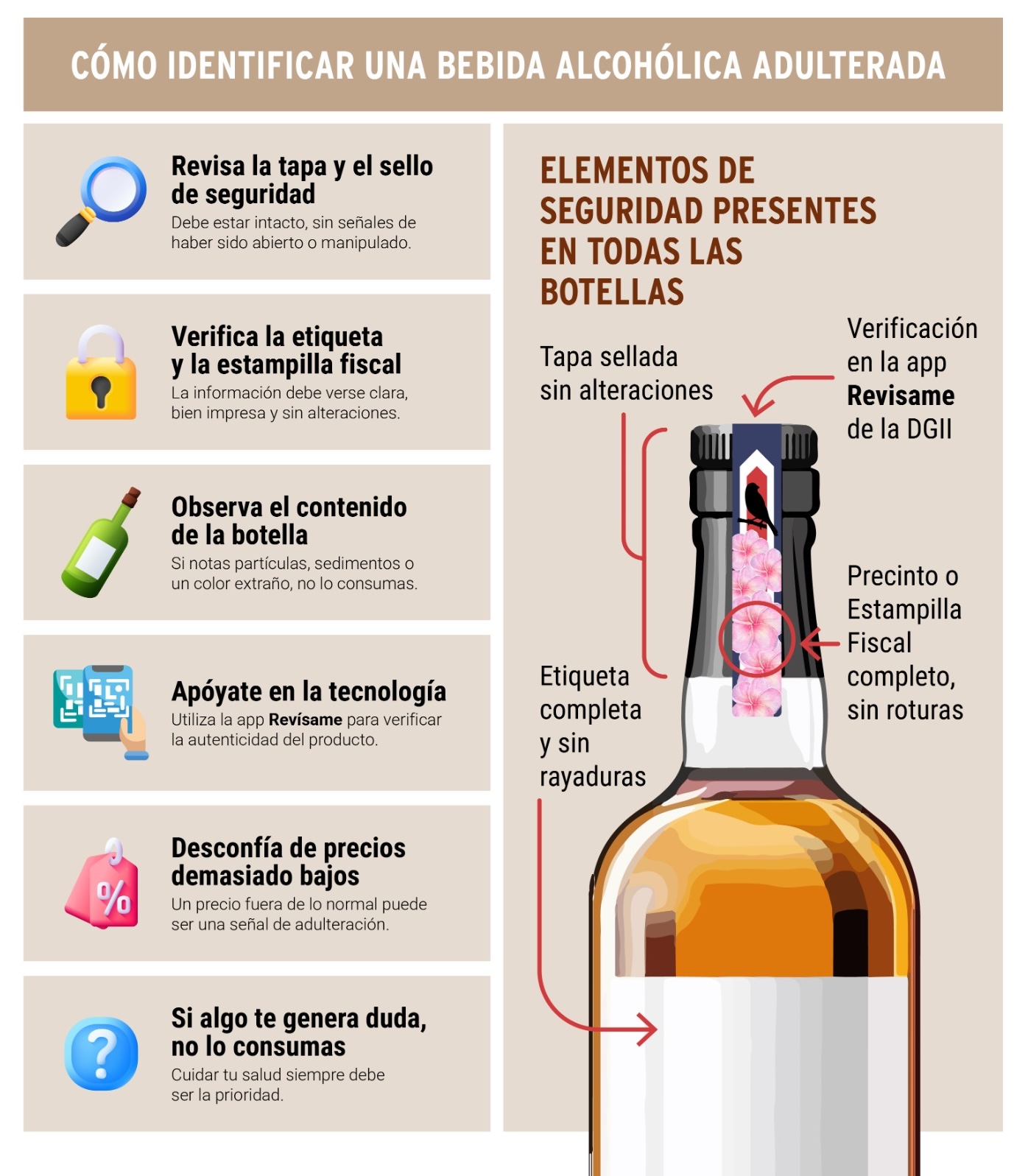 De igual forma, alertó sobre la necesidad de desconfiar de precios extremadamente bajos. Cuando una bebida se comercializa muy por debajo del valor habitual del mercado, puede tratarse de un producto falsificado o adulterado, por lo que se recomienda no adquirirlo.
