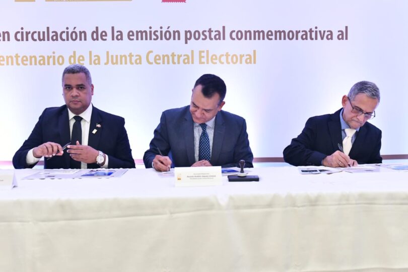 Santo Domingo. – La Junta Central Electoral (JCE) y el Instituto Postal Dominicano (Inposdom) pusieron en circulación la emisión del sello postal del órgano electoral, en el marco de las actividades conmemorativas del 100 aniversario de la institución, creada el 12 de abril de 1923.