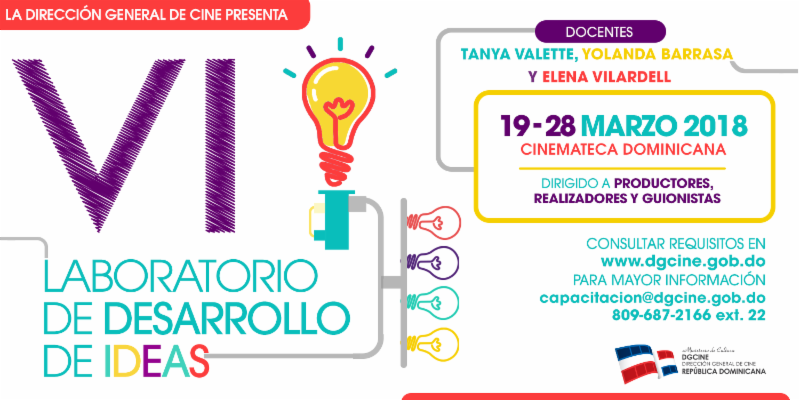 La Dirección General de Cine (DGCINE), a través de su departamento de Capacitación y Formación, invita a todos los productores, realizadores y guionistas a participar en el VI Laboratorio de Desarrollo de Ideas, el cual se llevará a cabo del 19 al 28 de marzo de 2018, en las instalaciones de la Cinemateca Dominicana.